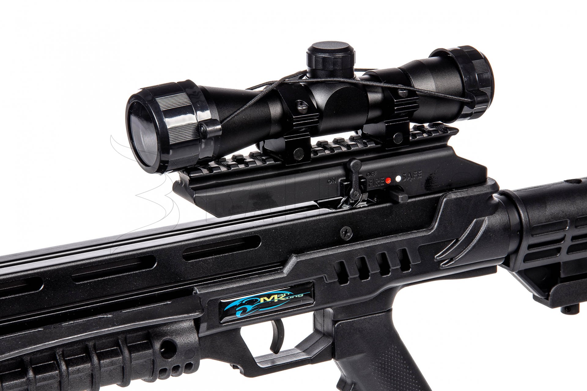 The manual safety is clearly visible and easily accessible from both sides of the crossbow. The polymer frame makes it durable and also lightweight (overall weight of only 3740 g). The foregrip is outfitted with finger guards for increased safety.