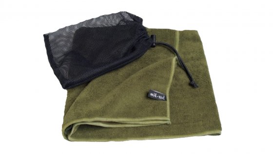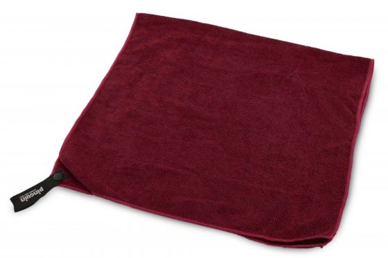 Quick-drying terry towel made of lightweight antibacterial microfiber. Includes a loop with a button snap and a mesh transport pouch.