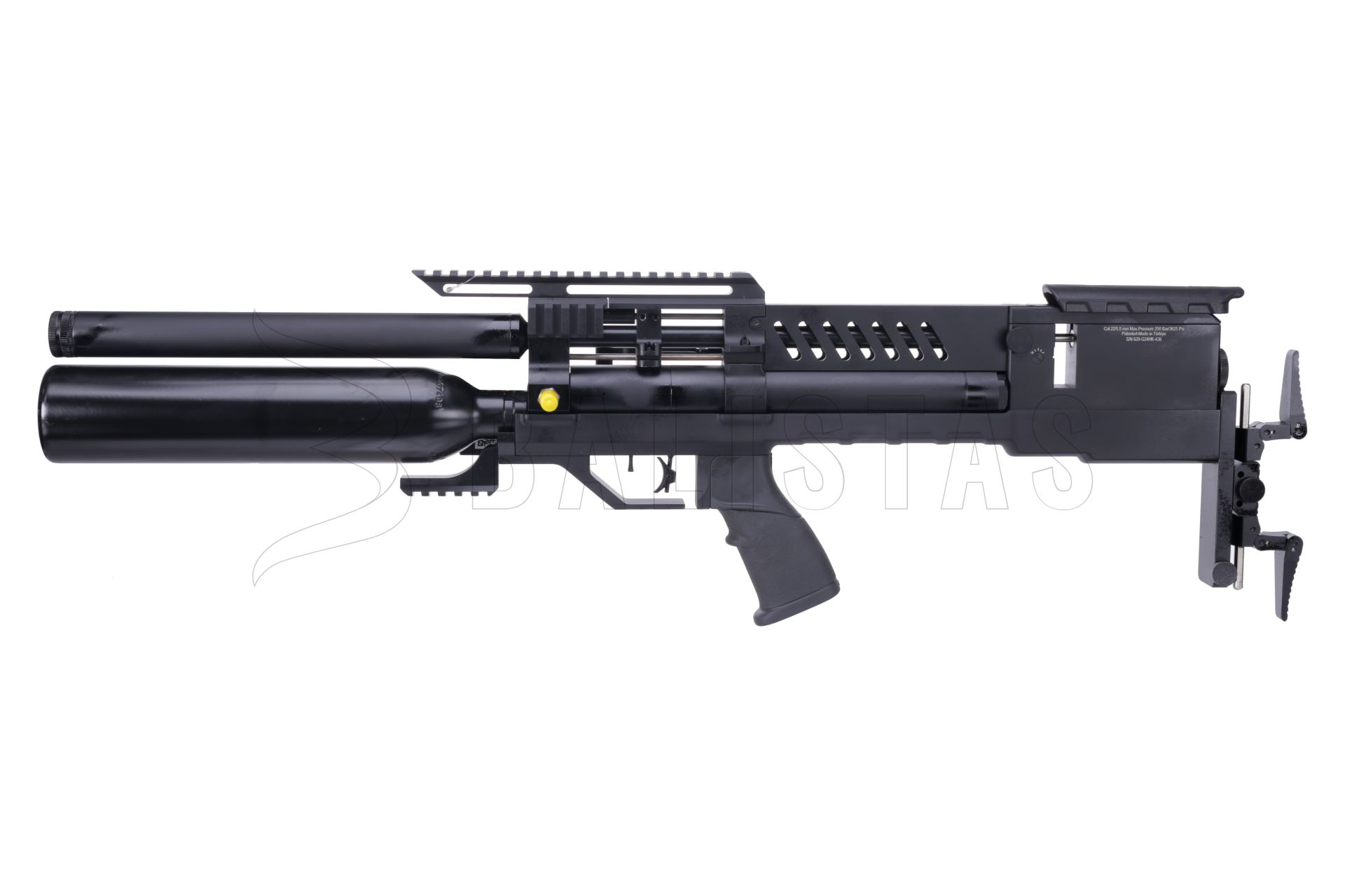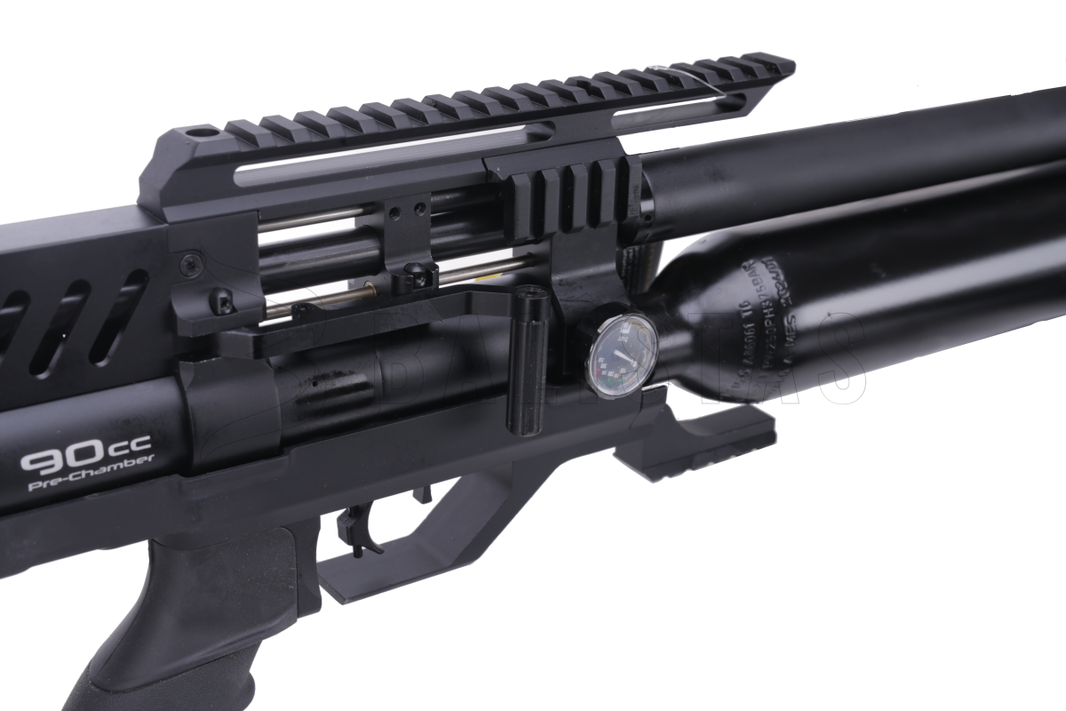 The aluminium cartridge has a capacity of 425 cc and a working pressure of 250 Bar. It can be filled using the regular quickfill pin. There are two pressure gauges - the rear one showing the pressure at the regulator and the front one showing the actual pressure in the cartridge. For even greater consistency, the regulator is further aided by a 90cc power plenum.