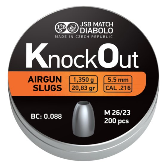 KnockOut Slugs in .216 caliber (5,5 mm) from renowned Czech manufacturer JSB.